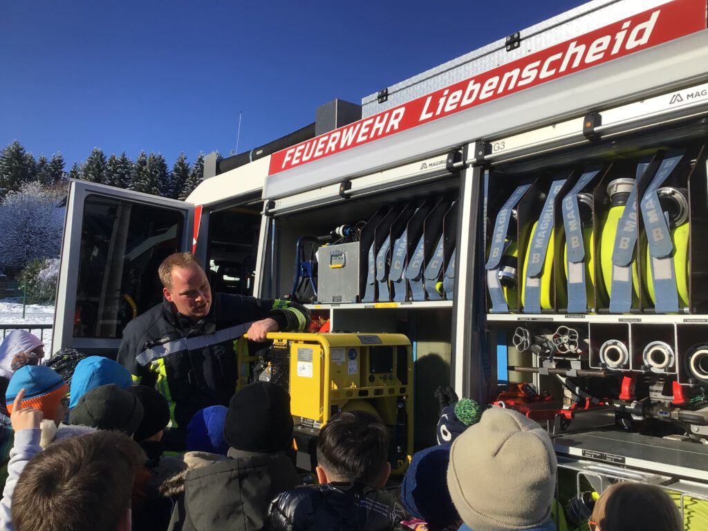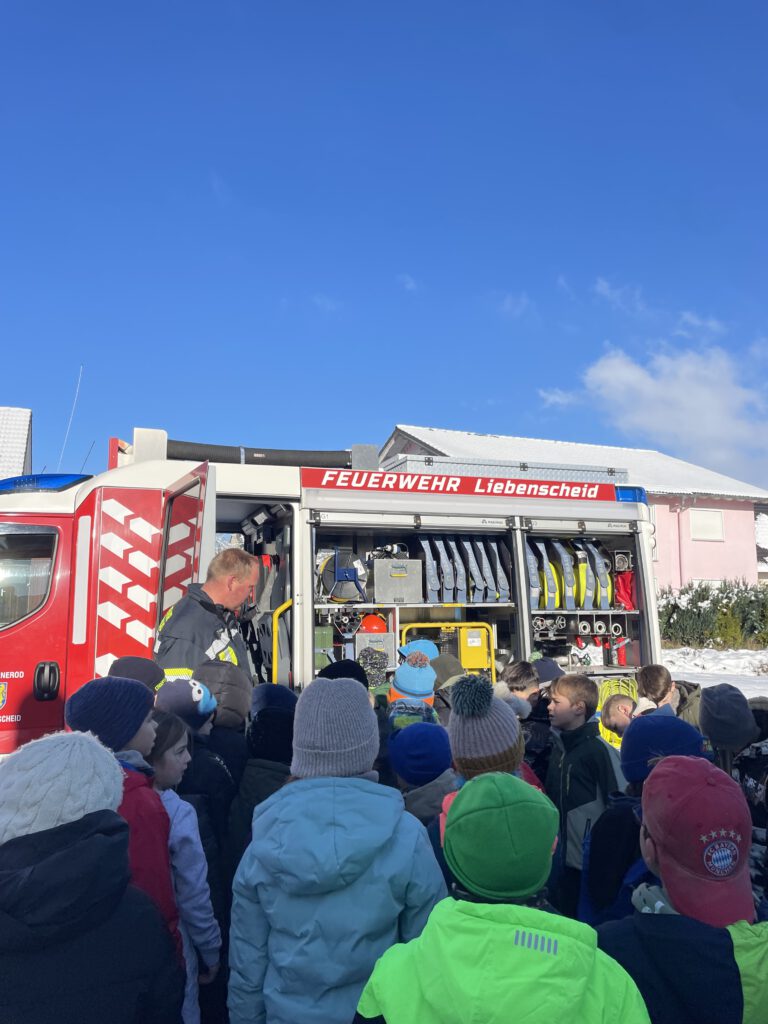 Feuerwehrmann Herr Hellbach von der Freiwilligen Feuerwehr Liebenscheid besuchte die Schülerinnen und Schüler.