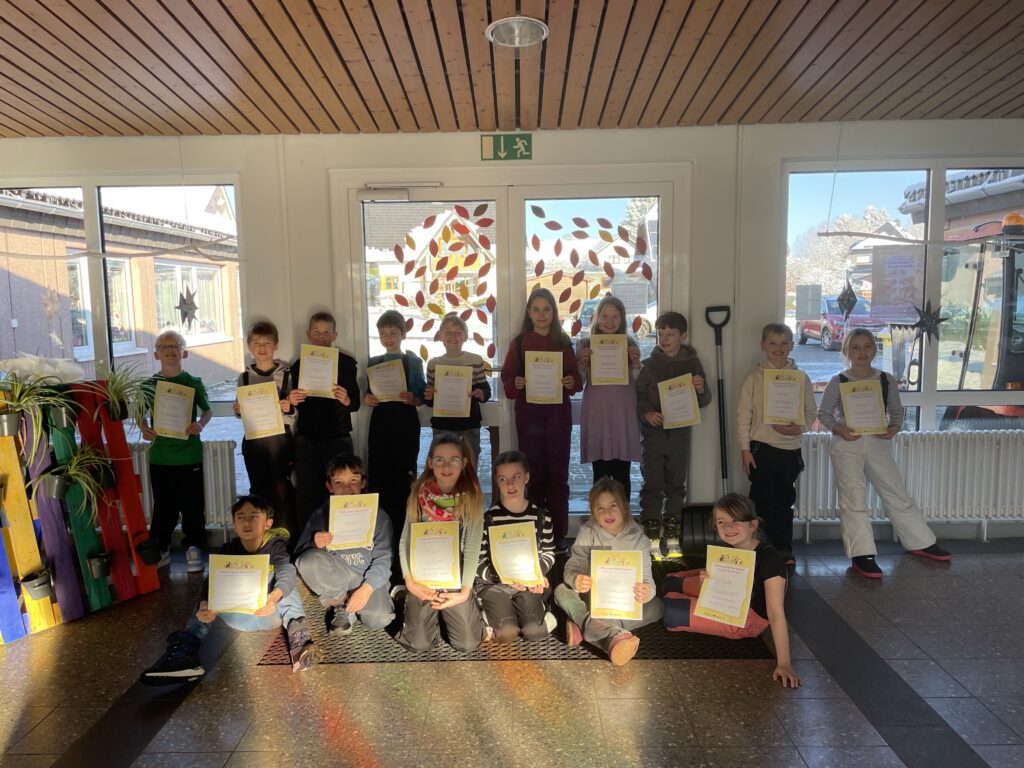 Der Polizist, Herr Röhl, hat die 3. Klassen der Schule besucht. Er sprach mit den Kindern über Gefahren im Straßenverkehr und erklärte, wie wichtig ein verkehrssicheres Fahrrad und das Tragen des Helms sind.